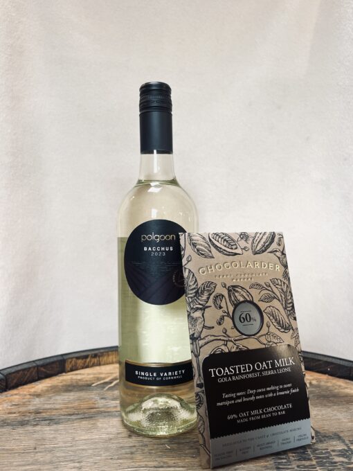 - Chocolarder Toasted Oat Chocolate: Made by hand in Cornwall, this rich chocolate combines ethically sourced cacao with toasted oats, creating a smooth, nutty flavour that perfectly complements the zesty freshness of the Bacchus wine. The delicate crunch of the oats adds a unique texture to each bite.